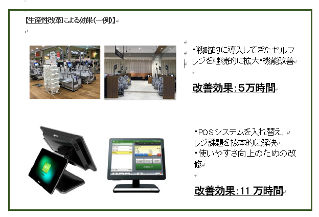 2021年1月から開始した生産性改革プロジェクトでは、人時を3%(70万人時)改善したことにより人時生産性が向上したことが確認できました。
