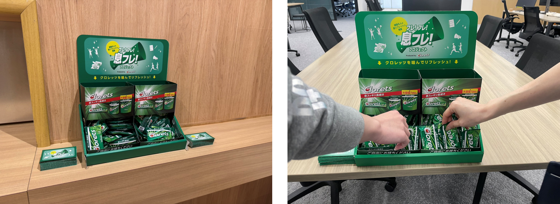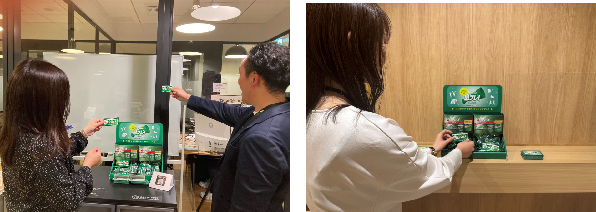 本プロジェクトの取り組みの一つとして、社員の生産性向上や健康経営を目指す企業3社に、 オフィスやワークスペースでのクロレッツのサンプリングを実施しました。その結果、多くの方から、業務の合間にガムを噛むことを取り入れることで、リフレッシュや気分転換のきっかけになったという声をいただきました。