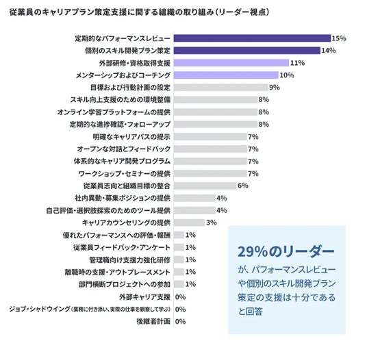 従業員のキャリアプラン策定支援に関する組織の取り組みとして「定期的なパフォーマンスレビュー(15%)」や「個別のスキル開発プラン策定(14%)」が挙げられました。これらの取り組みは、定型的な運用にとどまっていることが多く、従業員との意義ある対話にはつながっていません。