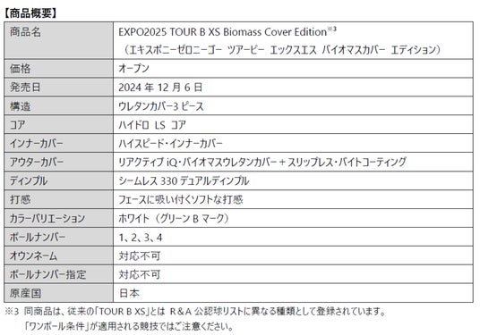 同商品は、当社として初めてアウターカバーに植物由来のバイオマス原材料を約45%配合しています。性能・品質についても、従来の「TOUR B XS」※2と同等であり、トッププロが勝利のために追求する「飛んで、止まる」という性能を保持しています。