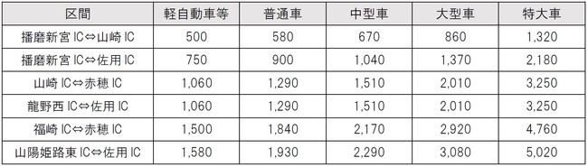 今回の開通区間を経由する通行料金の例(通常料金)