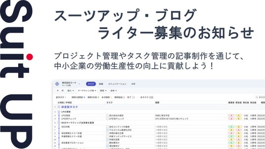 株式会社スーツ(所在地:東京都千代田区、代表取締役社長CEO:小松 裕介)は、チームのタスク管理・プロジェクト管理ツール「スーツアップ」のスーツアップ・ブログにおいて、2025年4月から6月までの期間にブログを書いてくれるボランティア・ライターを募集します。