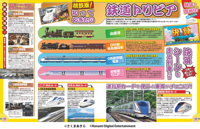 桃鉄を語るうえで書かせない“鉄道”についても深堀り! ゲーム内で毎年3月に表示される決算シーンを走る車両のモデルを解説。モデルとなった車両を実際に見られるスポットも紹介しています。そのほか、鉄道開業150年の今年、西九州新幹線をはじめ、続々とデビューした観光列車など、“リアル桃鉄”(ゲームに登場する物件を実際に鉄道で巡る旅)が楽しくなる情報も満載です!
