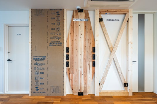 CLTハイブリッド構法とは、日本古来の木造軸組工法における筋交い部分をCLTパネルを用いた耐力壁に置き換えた工法で、当社がオリジナルで開発いたしました。