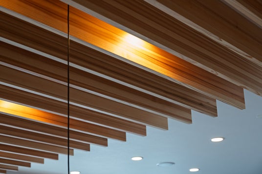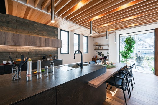 〈ダイニングキッチンのルーバー天井には広島県産材を使用〉