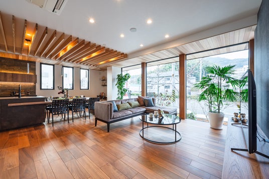 本展示場のリビングダイニングキッチンはCLTハイブリッド構法の特徴である、大空間と大開口を実現しました。