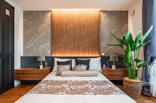 〈寝室/木格子と間接照明で落ち着いた雰囲気〉