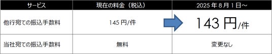 お客さまからの温かいご支持と継続的なご利用により、当社は着実に成長を重ねることができました。“お客さまのビジネスの成長=当社の成長”という考えのもと、こうした成長を支えていただいたことへの感謝の意を込めて、2025年8月1日より通常の他行宛て振込手数料を145円から143円に引き下げ、お客さまへの還元を図るとともに、今後もさらに使いやすい銀行を目指してまいります。
