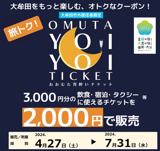 4月から始まった大型観光キャンペーン「福岡・大分ディスティネーションキャンペーン」に合わせ、市外から大牟田市を訪れる皆さんに市内飲食店や宿泊などをお楽しみいただくため、プレミアム付きチケット「おおむた宵酔いチケット」を販売します。