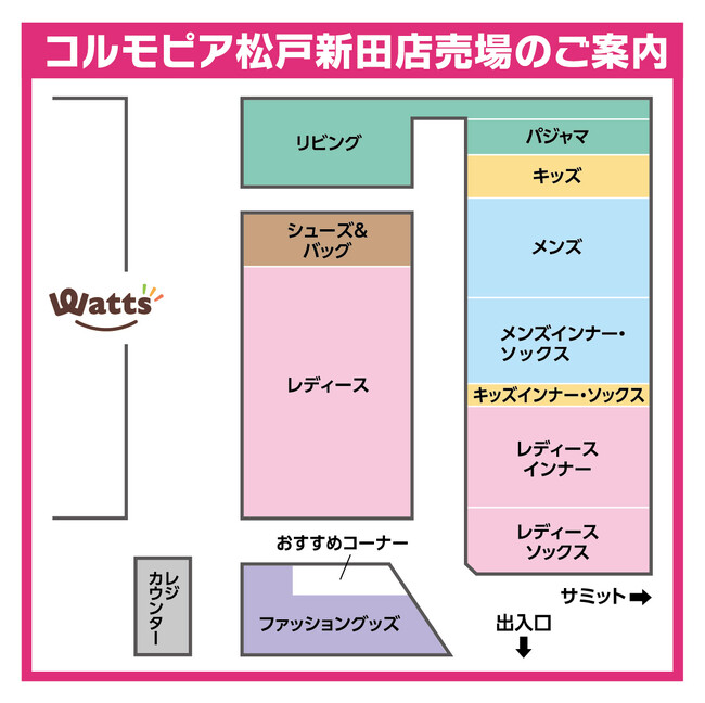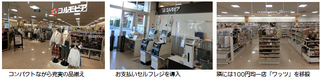 サミットストアに隣接する衣料館「コルモピア」もレイアウトを変更し、コンパクトになりました。レディースを中心に、メンズやキッズのアウターやインナー、シューズ・バッグ、寝具・服飾雑貨等を取り揃えています。また、新たにお支払いセルフレジを導入し、精算がスムーズになりました。別棟にあった100円均一店「ワッツ」も、コルモピアの隣に移設しました。