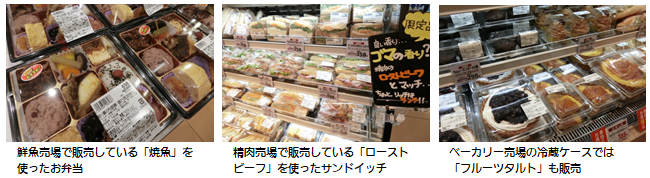 総菜売場では、生鮮売場で販売する新鮮な食材を使った寿司や丼物、鮮魚売場の「焼魚・煮魚」や精肉売場グリルキッチンコーナーの「お肉総菜」を使ったお弁当等を取り揃えています。また、ベーカリー売場の冷蔵ケースでは、フルーツをたっぷり使った「フルーツタルト」や精肉売場で販売しているローストビーフを使った「ローストビーフサンド」等も販売しています。