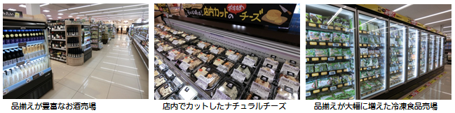 お酒売場では、ビールや缶チューハイ、ワインの売場を広げると共に、若い方に支持の高いフルーツ系のお酒やノンアルコール等の商品も豊富に品揃えしています。更にチーズ売場では、おつまみに最適なチェダーやブリー等のナチュラルチーズを、店内で適量にカットして販売します。また、冷凍食品売場では新たな冷凍ケースを導入して品揃えを約2.5倍に増やし、冷凍野菜・果実や冷凍スイーツ、お弁当用商品のコーナーを拡大しました。