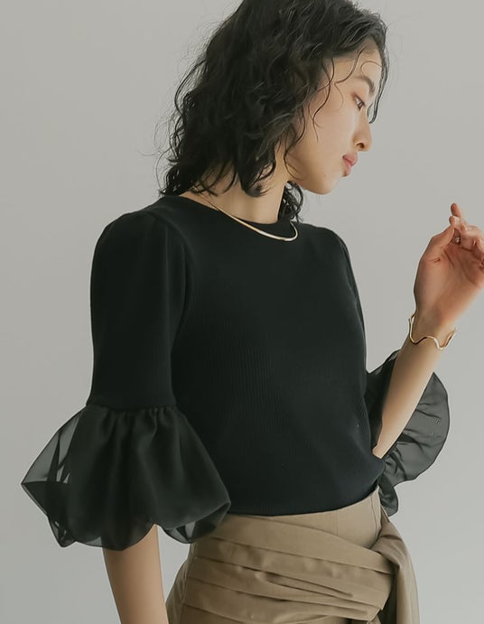 [2024 SUMMER COLLECTION][森カンナさん着用]異素材切り替えバルーンスリーブ七分袖リブニットトップス