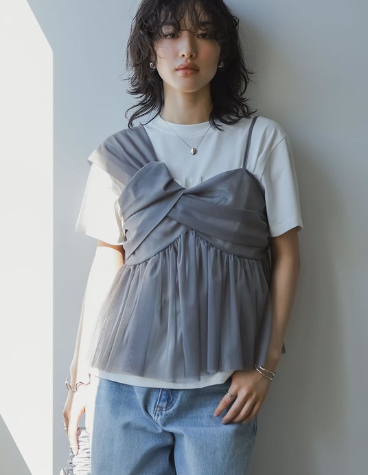 [販売枚数1万枚突破!]ソフトチュールアシンメトリーデザインキャミソールトップス
