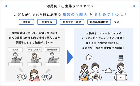 mila-e 申請は、自治体窓口DXサービスです。複数手続きをまとめて1回、スマートフォン等で申請できる[出生届ワンスオンリー]や、「mila-e クーポン」と組み合わせて、産後ケア事業でご利用いただいております。