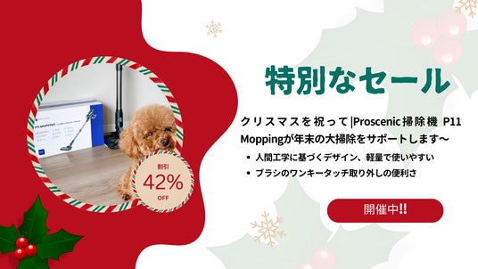 クリスマスを迎えるこの喜びの季節に、Proscenicはお得なお祝いをお届けします。皆様の年末の大掃除を手助けするために、Proscenic掃除機P11 Moppingが最大42%OFFで提供されます。この機会に、効率的で先進的な清掃ソリューションでお家を一新しませんか。