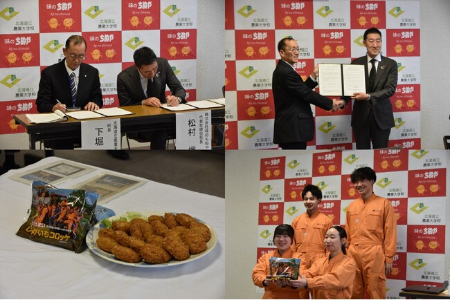 北海道立農業大学校(下堀亨校長)と国内の冷凍コロッケトップシェアを誇る冷凍食品メーカー「株式会社味のちぬや(代表取締役社長:松村信人)」は、2月8日に人材育成や農産加工品開発などに関する連携協定を結んだ。
