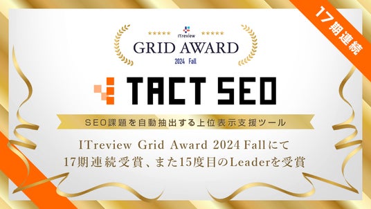 株式会社ウィルゲート(本社:東京都港区、代表取締役:小島 梨揮、以下「ウィルゲート」)が提供するSEOツール「TACT SEO」は、アイティクラウド株式会社(本社:東京都港区、代表取締役社長 兼 CEO:黒野 源太)が主催する「ITreview Grid Award 2024 Fall」の「SEOツール」部門において、認知度とユーザー満足度が優れているサービスに贈られる「Leader」を受賞したことをお知らせいたします。今回でSEOツール部門は17期連続受賞、「Leader」の受賞は15度目(※1)となります。