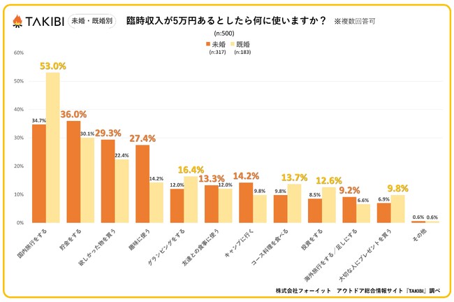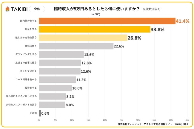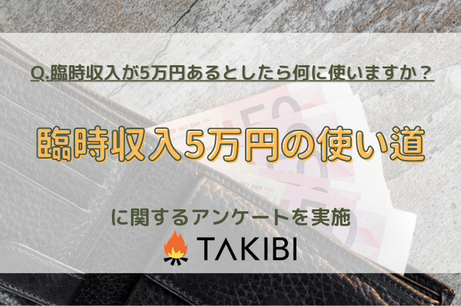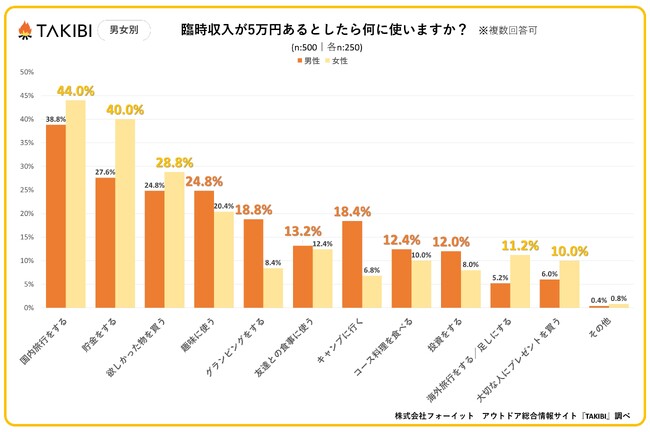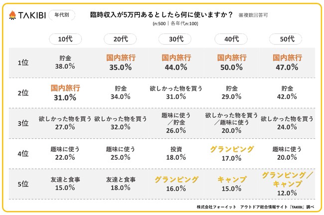 キャンプやグランピングを中心としたアウトドア総合情報サイト「TAKIBI」の運営をおこなう株式会社フォーイットは、全国の10代~50代までの男女500人を対象に臨時収入があった際の使い道に関するアンケートを実施し、男女別・年代別等の特徴についてまとめました。