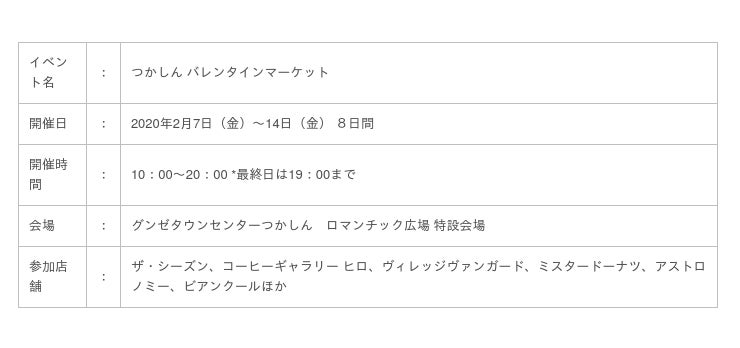 グンゼ株式会社(本社:大阪市北区、社長:廣地 厚)の連結子会社、株式会社つかしんタウンクリエイト(本社:兵庫県尼崎市、社長:深山 隆造)が運営する商業施設グンゼタウンセンターつかしんで、「バレンタインマーケット」を2月7日(金)~14日(金)まで開催します。