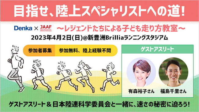 日本陸上競技連盟と本連盟オフィシャルスポンサーであるデンカ株式会社(https://www.denka.co.jp/)は、このたび初めてのイベント「目指せ、陸上スペシャリストへの道!~レジェンドたちによる子ども走り方教室~」を2023年4月2日(日)に新豊洲Brilliaランニングスタジアム(東京都江東区)にて開催します!
