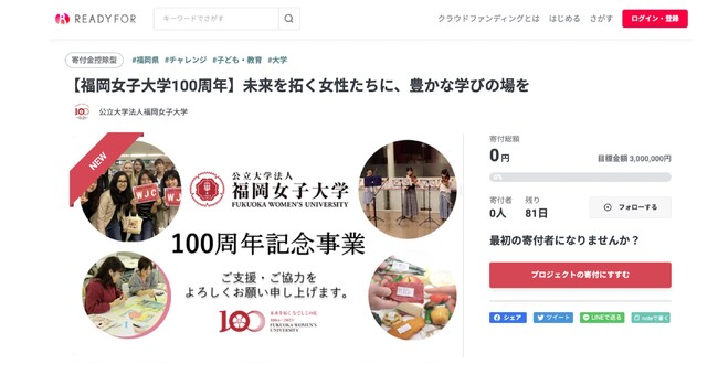 日本初・国内最大級のクラウドファンディングサービス「READYFOR」を運営するREADYFOR株式会社(本社:東京都千代田区、 代表:米良はるか)と公立大学法人福岡女子大学(所在地:福岡県福岡市、理事長・学長:向井剛)は業務提携を締結いたしました。また、本日、提携後第一号としてクラウドファンディングプロジェクト「【福岡女子大学100周年】未来を拓く女性たちに、豊かな学びの場を」を公開いたしました。