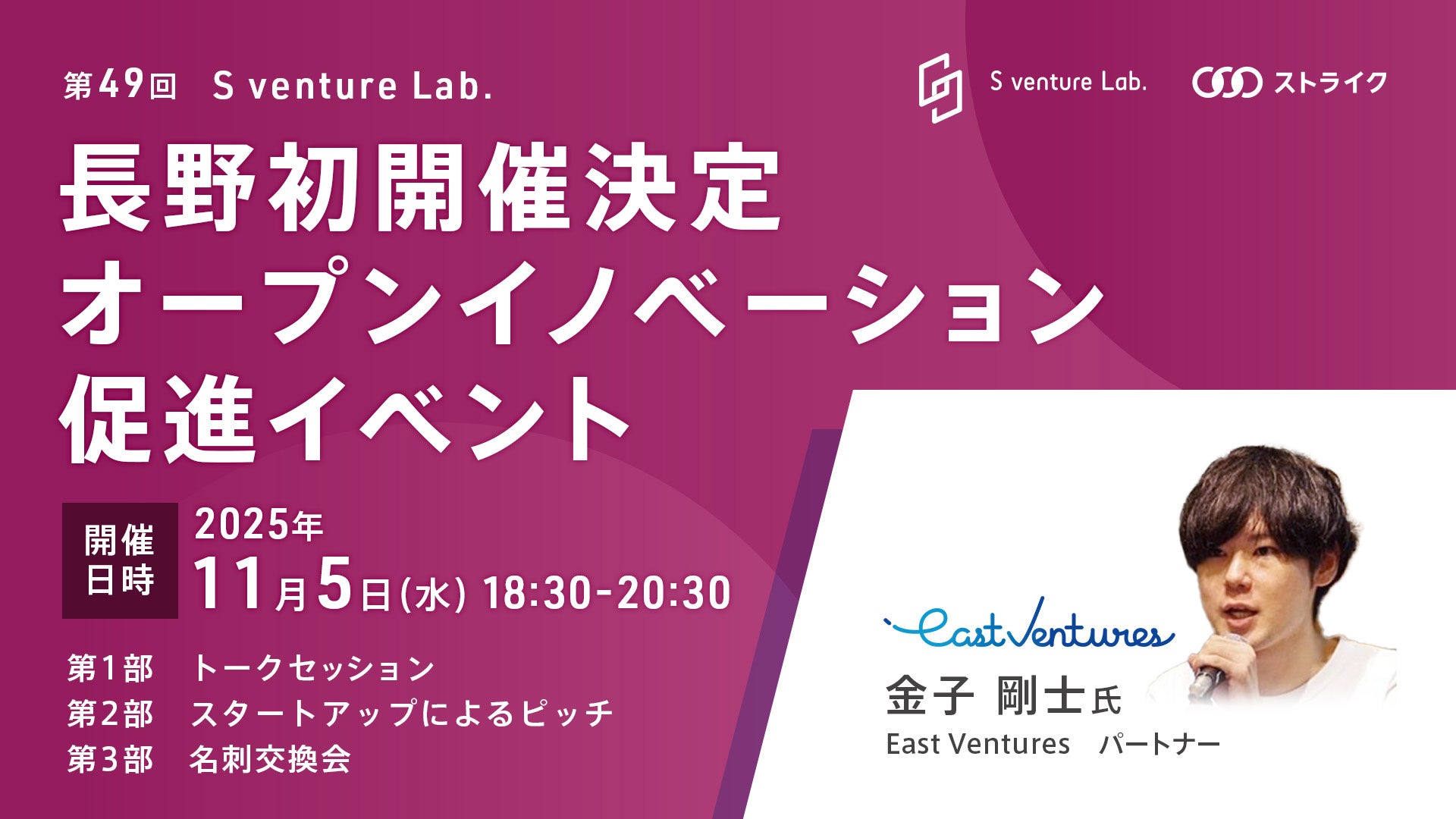 株式会社ストライク(本社:東京都千代田区、代表取締役社長:荒井邦彦)は2025年11月5日(水)、オープンイノベーションイベント第49回「S venture Lab.」を長野にて初開催いたします。