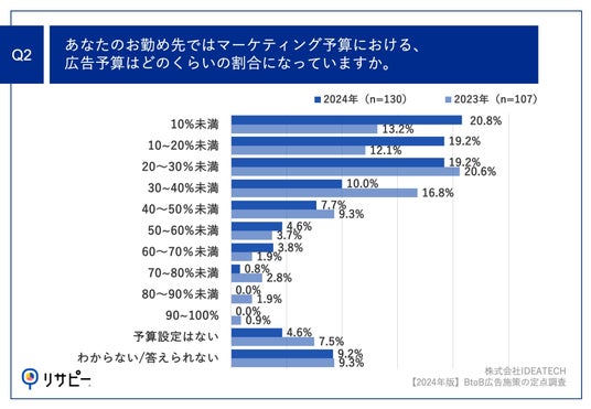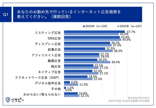 ワンストップでリサーチデータマーケティングを実現する「リサピー(R)️」(https://ideatech.jp/service/research-pr)を運営する株式会社IDEATECH(本社:東京都港区、代表取締役社長:石川友夫)は、BtoB事業の広告担当者130名を対象に、【2024年版】BtoB広告施策の定点調査を実施しましたので、お知らせいたします。
