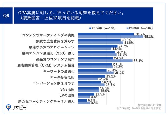 まず、BtoB企業が実施しているインターネット広告施策では、2023年と同じく「リスティング広告」(47.7%)、「SNS広告」(43.8%)が上位になりましたが、マーケティング予算における広告予算については、「30%未満」が59.2%に上り、2023年から13.3ポイント増加しました。また、約6割が、広告施策における目標CPAを「下回っている」と回答しているものの、50.8%(2023年比8.0ポイント減)が、2023年と比較して「CPAの上昇」を実感しています。さらに、実施しているCPA高騰対策としては、第1位「コンテンツマーケティングの実施」(39.2%)、第2位「無駄な広告費用を減らす」(30.0%)という結果になりました。