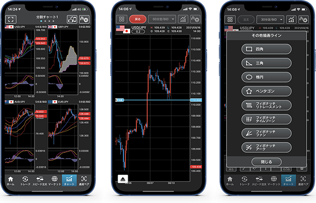 1つの画面で本番口座とデモ口座の切り替えが可能なので、慣れていない通貨ペアへのチャレンジやお取引の練習に使えるはじめてのFXに最適なアプリです。