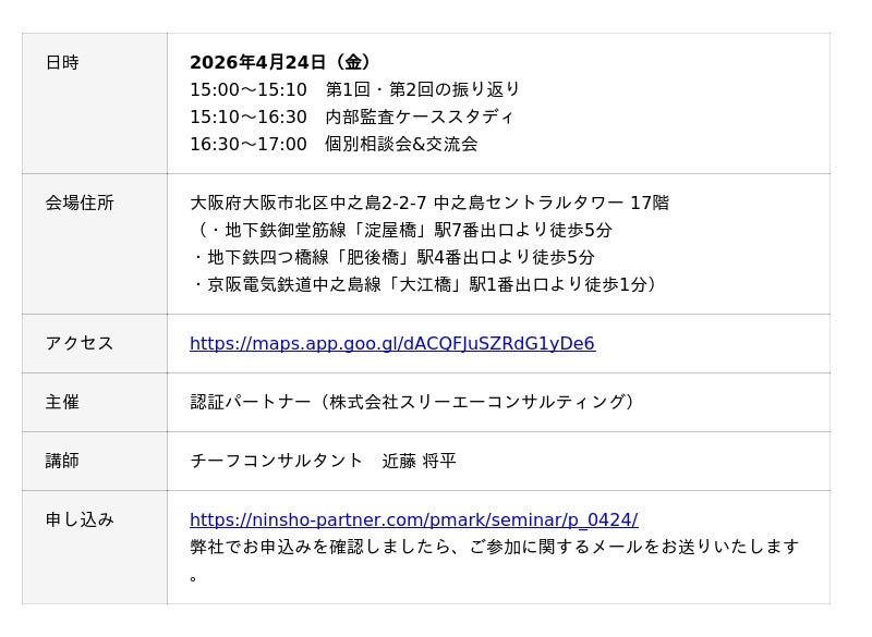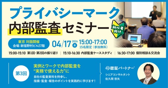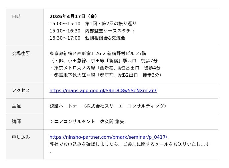 Pマーク、 ISOコンサルにおける支援実績 No.1(注1)のISO/Pマークの取得・運用支援サービス「認証パートナー」を提供する株式会社スリーエーコンサルティング(本社:大阪府大阪市、代表取締役社長:竹嶋 寛人)は、4月17日(金)15:00より、東京・新宿にて「第3回 プライバシーマーク内部監査セミナー」を開催します。