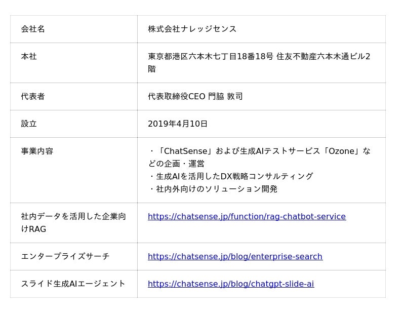 法人向けAIエージェント「ChatSense」の詳細はこちらをご覧ください。