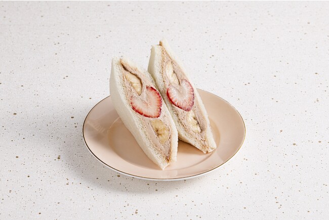 チョコクリームでバナナとハート型の苺をサンドしたかわいいサンドイッチです。