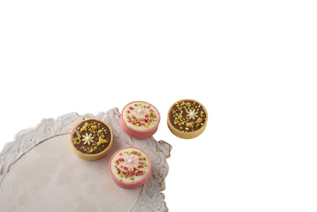グラハムクラッカーを使用したサクサクの生地にメレンゲクランチを敷き、ナッツ風味のジャンドゥーヤとストロベリーのフィリングをそれぞれ流し込んだ可愛いらしいタルトです。