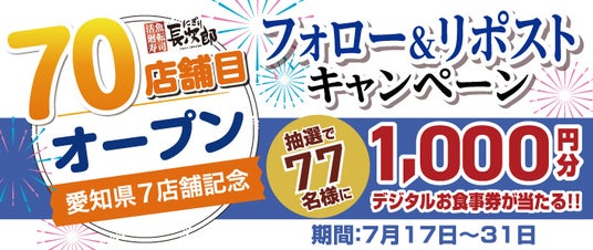 70店舗オープン(愛知県では7店舗目)記念として2024年7月31日(水)まで、「デジタルお食事券1,000円分」が77名様に当たる、お得なXキャンペーンを開催します。にぎり長次郎のX公式アカウントをフォローし、キャンペーンポストをリポストすることでご応募いただけます。本お食事券はにぎり長次郎各店舗で1,000円以上のお食事をしていただく際にご利用いただけます。