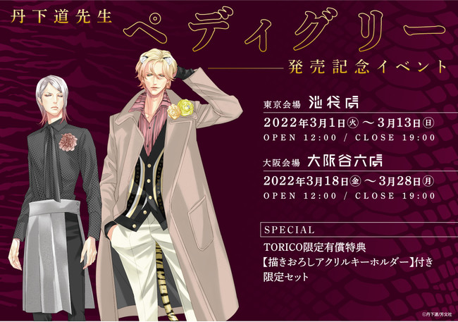 株式会社TORICO(本社:東京都千代田区 代表:安藤拓郎)は、2022年3月1日(火)~3月13日(日)まで東京都豊島区西池袋「池袋虜」にて、2022年3月18日(金)~3月28日(月)まで大阪府中央区谷町6丁目の「大阪谷六虜」にて、丹下道先生「ペディグリー」発売記念イベントを開催いたします。