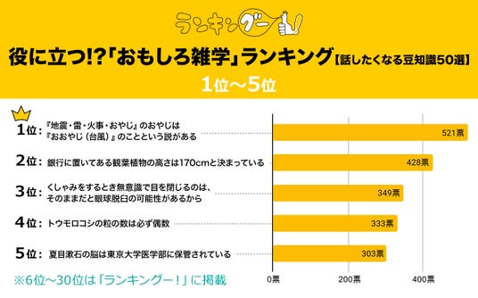 株式会社CMサイト(本社:大阪府大阪市、代表取締役社長:柴原 誠治)が企画編集する、「ちょっと気になる」を調べたランキングサイト『ランキングー!(https://rankingoo.net/)』は、『役に立つ!?「おもしろ雑学」ランキング【話したくなる豆知識50選】』の結果を、投票者のコメント付きで紹介する記事として公開しました。
