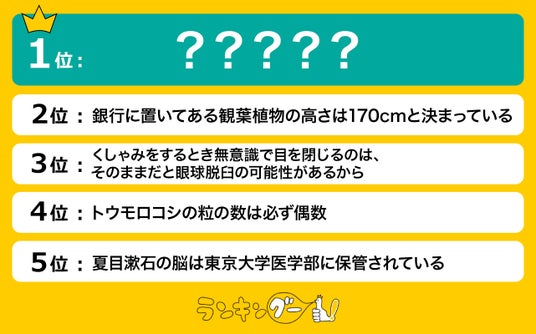2位はに選ばれた雑学は、「銀行に置いてある観葉植物の高さは170cmと決まっている」。3位から5位も僅差でランクインし、興味深い知識として、多くの票を集めました。まだまだたくさんある、思わず話したくなる雑学6位~30位は記事全文でご紹介しています!