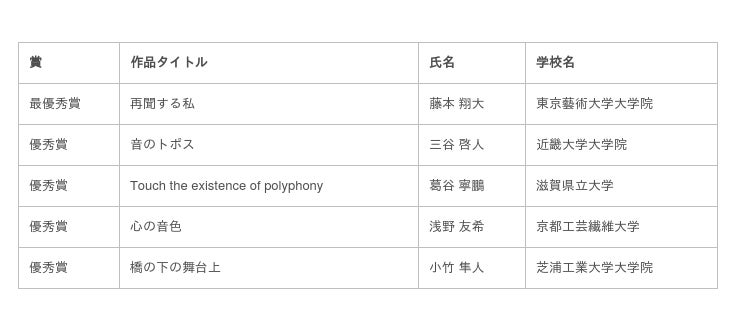 9回目の開催となる日本のテーマは「音色、空間、運動」です。今注目を集める音楽家の蓮沼執太氏を審査員長に迎え、建築家の藤原徹平氏、中山英之氏ら審査員による厳正な審査の結果、以下の通り最優秀賞1作品、優秀賞4作品が選出されました。