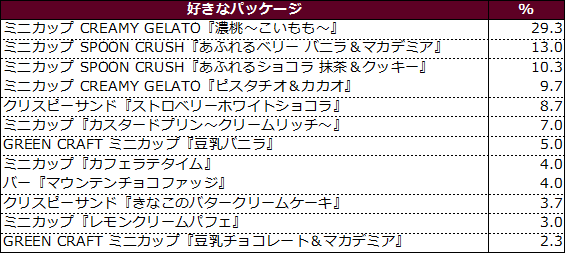 新フレーバーの好きなパッケージを聞いたところ、ミニカップ CREAMY GELATO(クリーミー ジェラート)『濃桃~こいもも~』(29.3%)が人気を集めました。