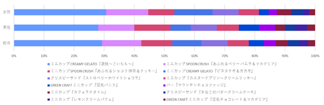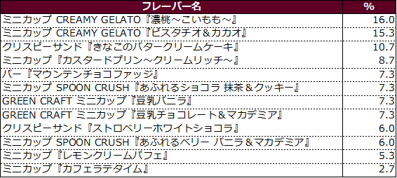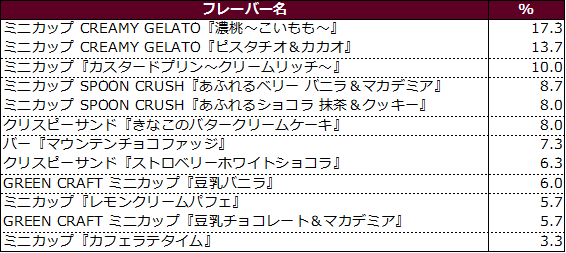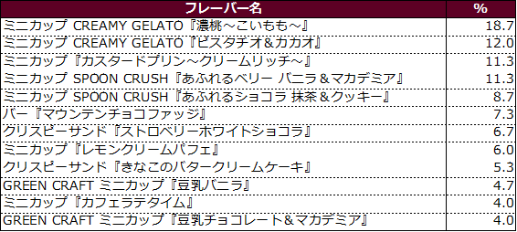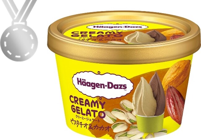 また、4位はミニカップ CREAMY GELATO(クリーミー ジェラート)『ピスタチオ&カカオ』(9.7%)で、4位まではゴールドのフタを採用した商品となっています。5位にはクリスピーサンド『ストロベリーホワイトショコラ』(8.7%)がランクインしました。