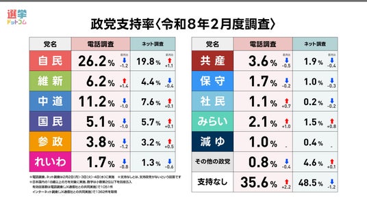 【調査概要】調査は令和8年2月2日(月)・3日(火)・4日(水)に実施。日本国内の18歳以上の方を調査対象とし、有効回答数は電話調査で1051件、インターネット調査で1362件を取得(いずれもJX通信社との共同実施)。各数値は小数第2位以下を四捨五入しています。