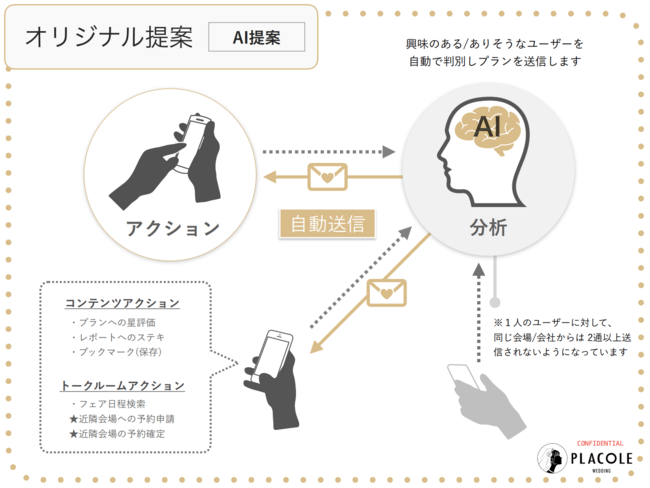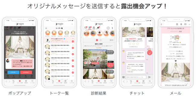 ブライダル業界で初のウェディングプランナーから花嫁さまに直接提案、アプローチができる機能。人口知能(AI)が、マッチングしたユーザーの中から会場にあったユーザーを選出。今まで利用いただいた12万組のユーザーのビックデータを活用し、そのユーザーに向けた最適なプランとウェディングレポート(挙式実例)をお届けしダイレクトにアプローチが可能。そこからユーザーとチャットで繋がり来店前に直接アプローチや予約獲得が可能になっております。AIメッセージを導入後、前年比120%増加の予約実績もあり、多くの広告費をかけずにユーザーへ直接のアプローチが可能となります。