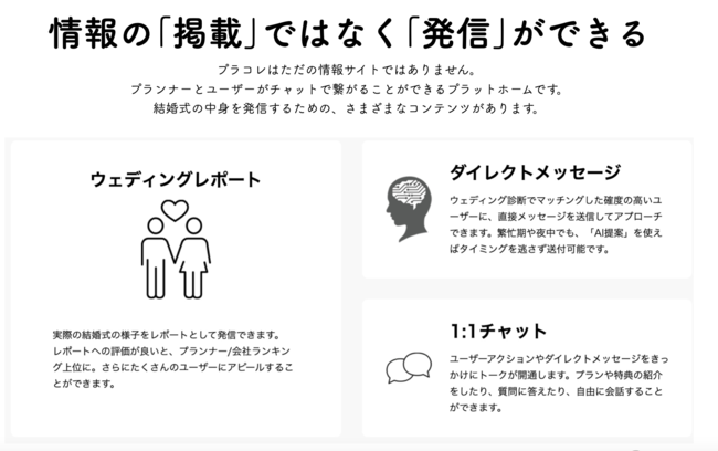 2022年3月現在、月間4000組以上のカップルが新規会員登録、合計2000名以上のウェディングプランナーが登録し、導入会場数は1120会場を越え、ブライダル業界初のチャットコミュニケーションメディアとして、独自の立ち位置を確立しています。