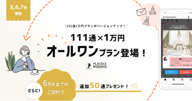 この度、「PLACOLE WEDDING」からそんなAIメッセージが期間限定でお得になるプランがリリース。通常100通10万円のプランが5,6,7月限定でオール1の、111通1万円のご提供となります。