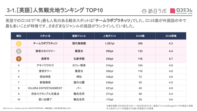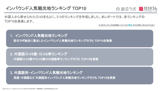 国内最大級メディア『訪日ラボ』及び 口コミサイトを”もっと”売上に変える店舗支援SaaS「口コミコム」を運営する株式会社mov(代表取締役:渡邊 誠、本社:東京都渋谷区、以下mov)は、観光名所に寄せられた最新の口コミデータから、独自の『インバウンド人気観光地ランキング』を発表しました。