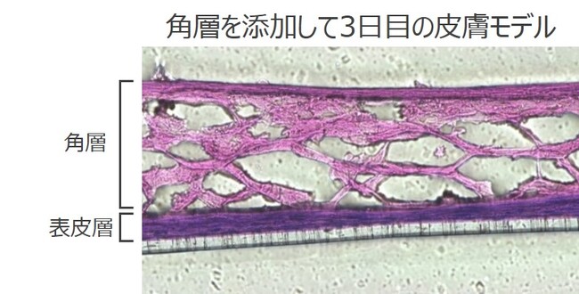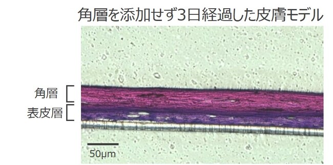 実際に角層を添加してから3 日目の状態を見てみると、角層を添加した皮膚モデルは、添加していない皮膚モデルよりも細胞の生存率が約 20%低下していました。さらに、角層を添加していない皮膚モデルの断面図では、皮膚モデルの角層がきれいに積み重なって層状に育っていた半面、角層を添加した皮膚モデルの断面図では、角層が厚くなり内側の層で多くの隙間ができていました。併せて、角層を添加した皮膚モデルでは水分の蒸散率が約20%高くなっていました。