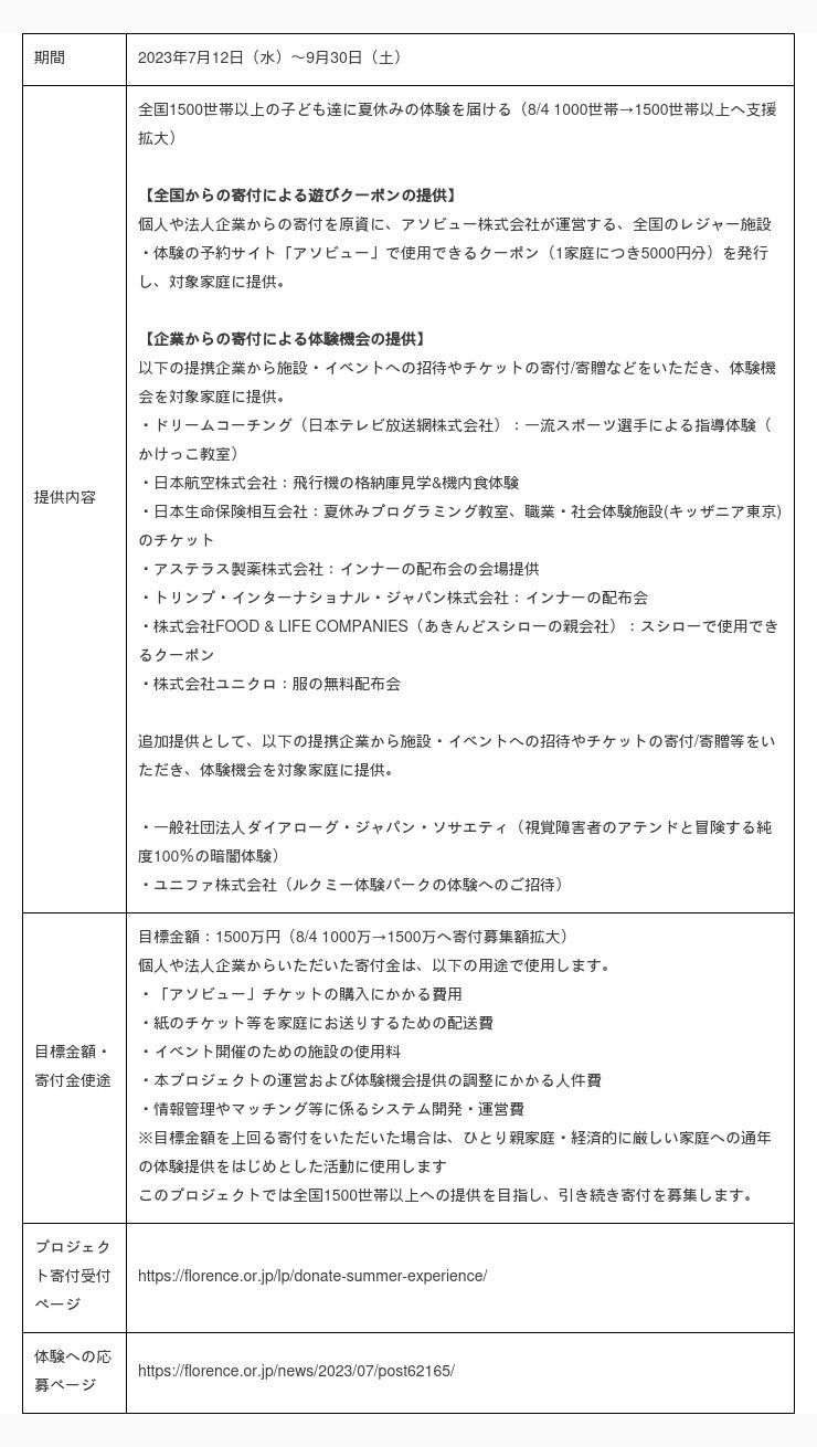 今回の取り組みは、メインパートナーのアソビュー株式会社をはじめとして、複数の企業からの賛同と全国からの寄付を原資に子どもたちに夏の思い出を届けていく活動です。寄付額1000万円を原資に、全国1000世帯の子ども達に体験をプレゼントすることを目標としました。