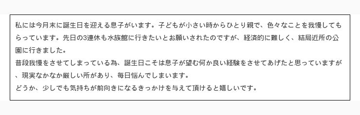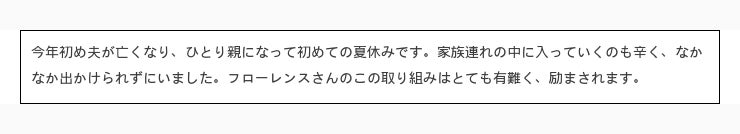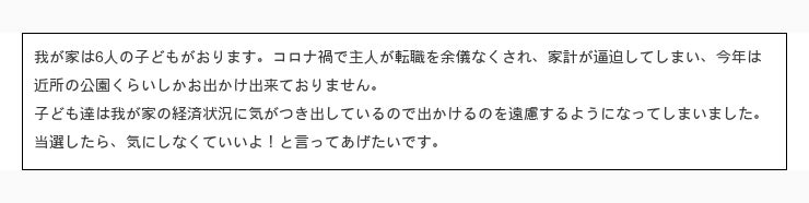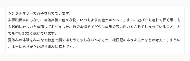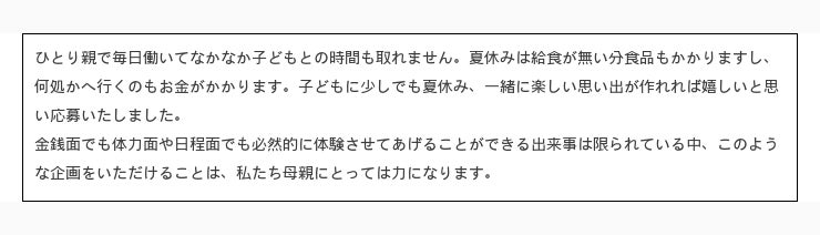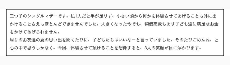 今回、申し込みと共に寄せられた親御さんからの生の声には、厳しい状況の中でも、なんとか子どもたちに夏休みの思い出を、体験の機会を作ってあげたいという思いが込められていました。