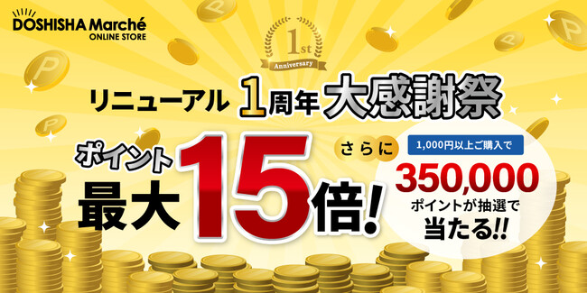 2021 年9月にリニューアルオープンしたドウシシャマルシェは、この9月で1周年を迎えます。リニューアル1周年大感謝祭の期間中は、最大で通常の15倍となる15%のポイント還元や、抽選で180名様に総額350,000ポイント(1等で最高10,000ポイント)が当たるWチャンス企画を実施します。